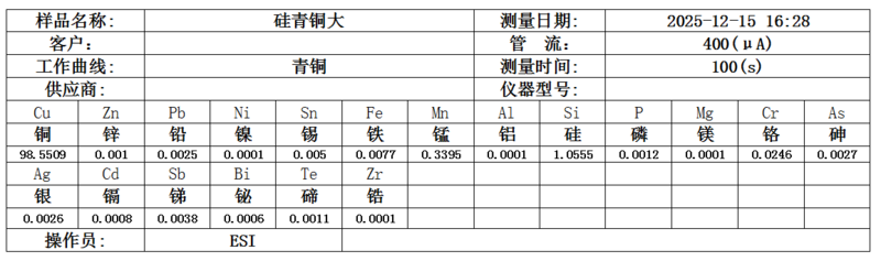 以下是台式合金分析仪EDX9000A用于快速测定硅青铜成分的测试报告: